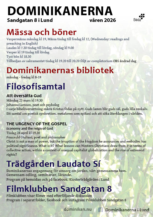 Dominikanerna är en katolsk klostergemenskap med ett hus mitt i Lund. Bröderna delar livet i klostret med bön och studier, men är också tillgängliga för möten och uppdrag utanför klostret. Vi har öppna gudstjänster i vårt kapell och inbjuder också till bl a studentverksamhet, filosofisamtal bibelgrupper och seminarier på Sandgatan. Dominikanerna är en del av den katolska gemenskapen i Lund, med bland andra Thomas av Aquino församling, Dominikansystrarna i Rögle, Domino studenter, Sankt Thomas skola.